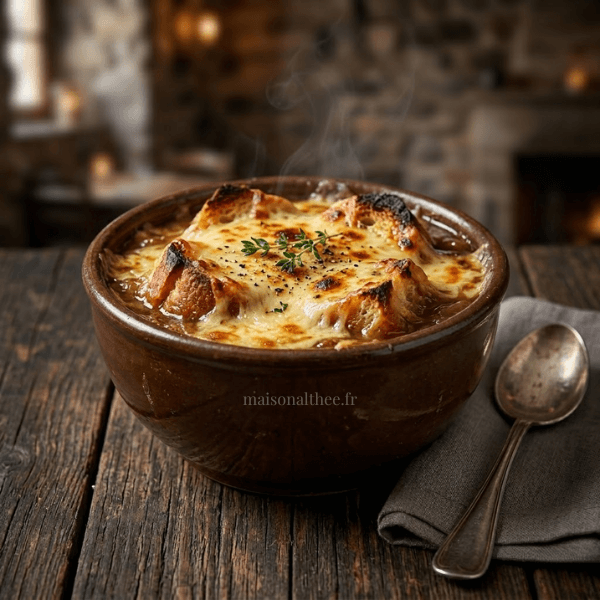 Comment la préparer : Émince finement les oignons et fais-les caraméliser lentement dans le beurre pendant 30 minutes jusqu’à ce qu’ils soient bien dorés. Ajoute le bouillon, le thym, le sel et le poivre. Laisse mijoter 20 minutes. Verse dans des bols allant au four. Pose une tranche de pain grillé sur chaque bol. Parsème généreusement de gruyère. Passe au grill 5 minutes jusqu’à ce que le fromage soit bien gratiné.