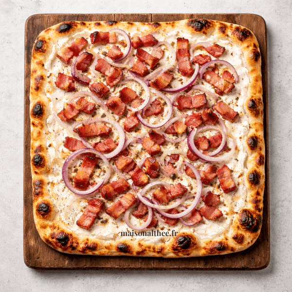 Comment la préparer : Étale très finement la pâte sur une plaque. Mélange la crème avec du sel, du poivre et une pincée de muscade. Tartine généreusement la pâte de ce mélange. Parsème de lardons crus et d’oignons finement émincés. Enfourne à 250°C pendant 8 à 10 minutes jusqu’à ce que les bords soient bien dorés et croustillants.